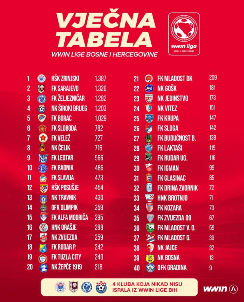Četrdeset je timova nastupalo u Premijer ligi BiH, a samo četiri je nikada nisu napustila – Sarajevo, Željezničar, Zrinjski i Široki Brijeg.